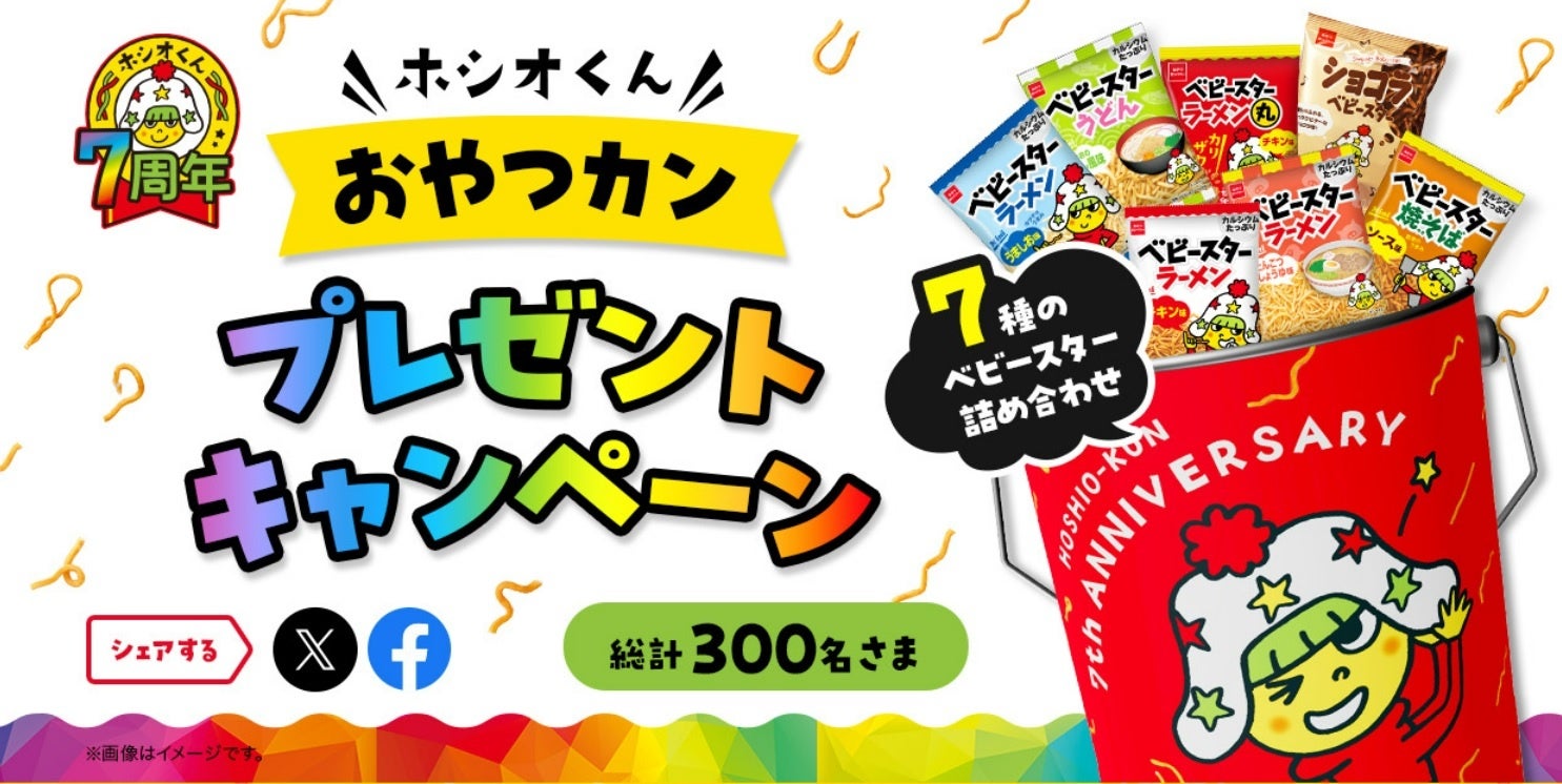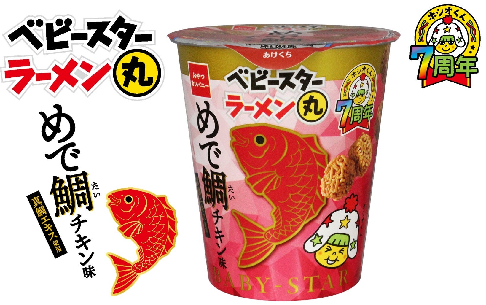 ホシオくんがデビュー7周年を迎え、記念商品第3弾が登場しました!「めで鯛チキン味」は、ベビースターラーメン丸チキン味に真鯛エキスを加えた特別な味わいです。