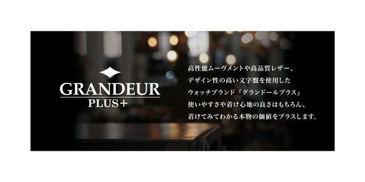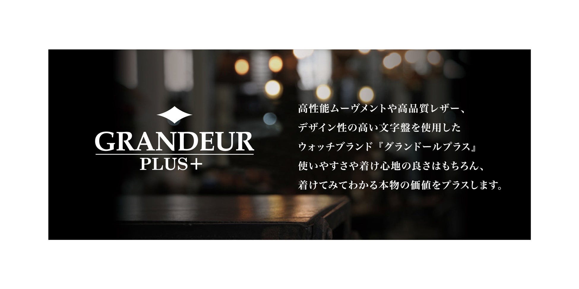 GRANDEUR PLUS+ブランドの特徴や商品スペック、着用イメージなどが紹介されており、高性能ムーヴメントや高品質レザーを使用し、デザイン性の高い文字盤を採用したウォッチブランドです。