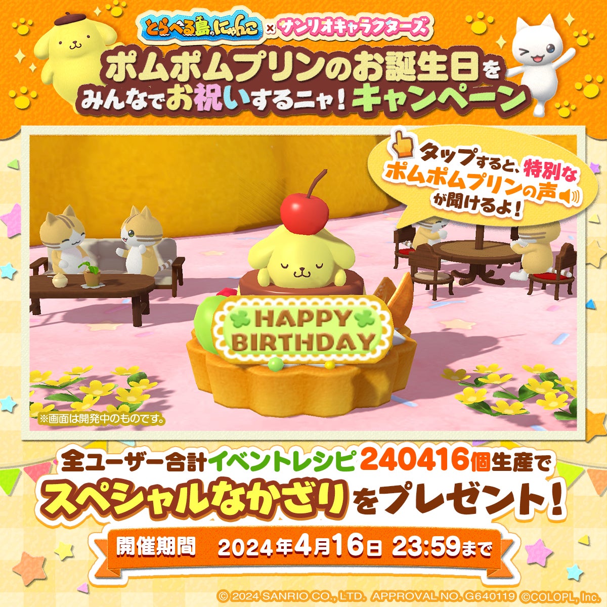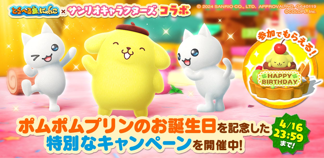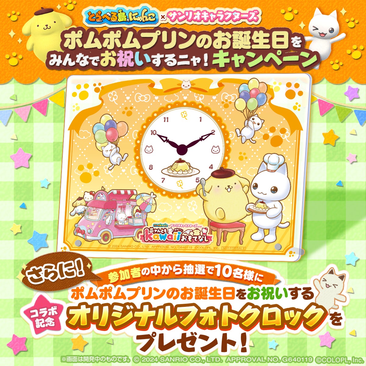 本日はポムポムプリンの誕生日で、特別なアイテムやオリジナルフォトクロックがプレゼントされます。