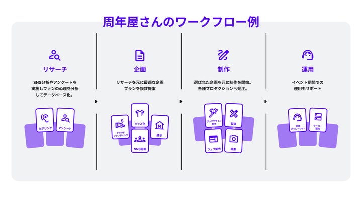 周年屋さんでは、企画立案、費用調達、制作を一元管理し、IPの周年企画の効果を最大化する3つの強みを提供します。