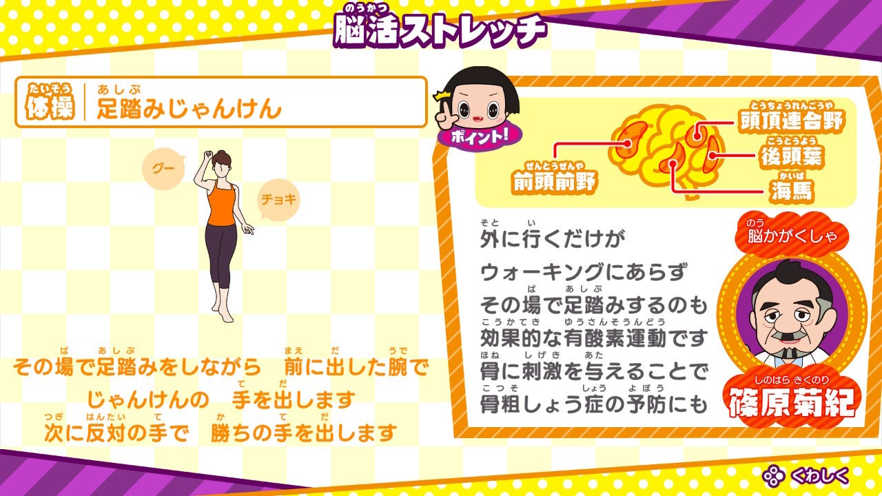 「脳活ストレッチ」:実際に身体を動かすことで脳を刺激できる、脳活ストレッチを教えてくれます。