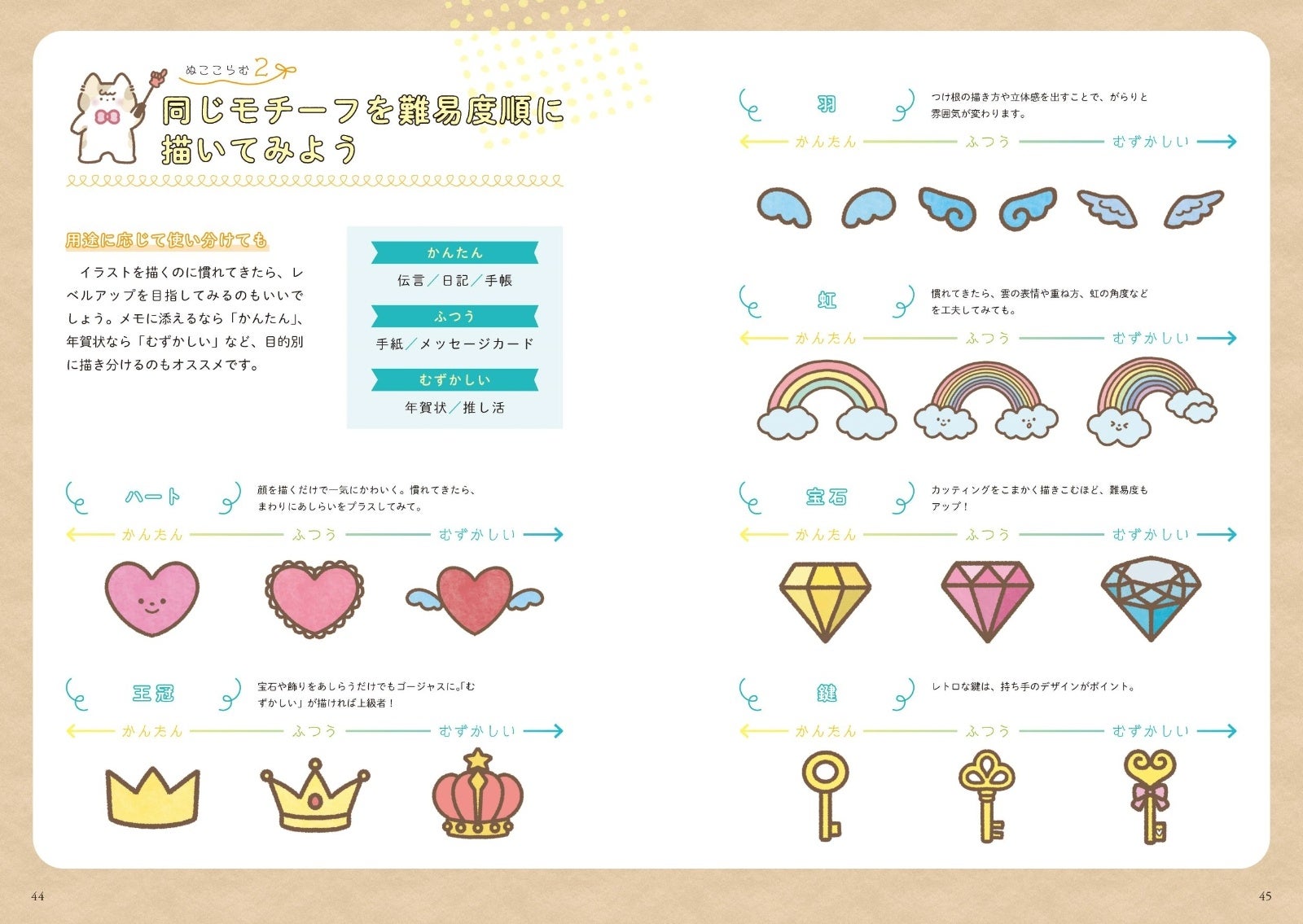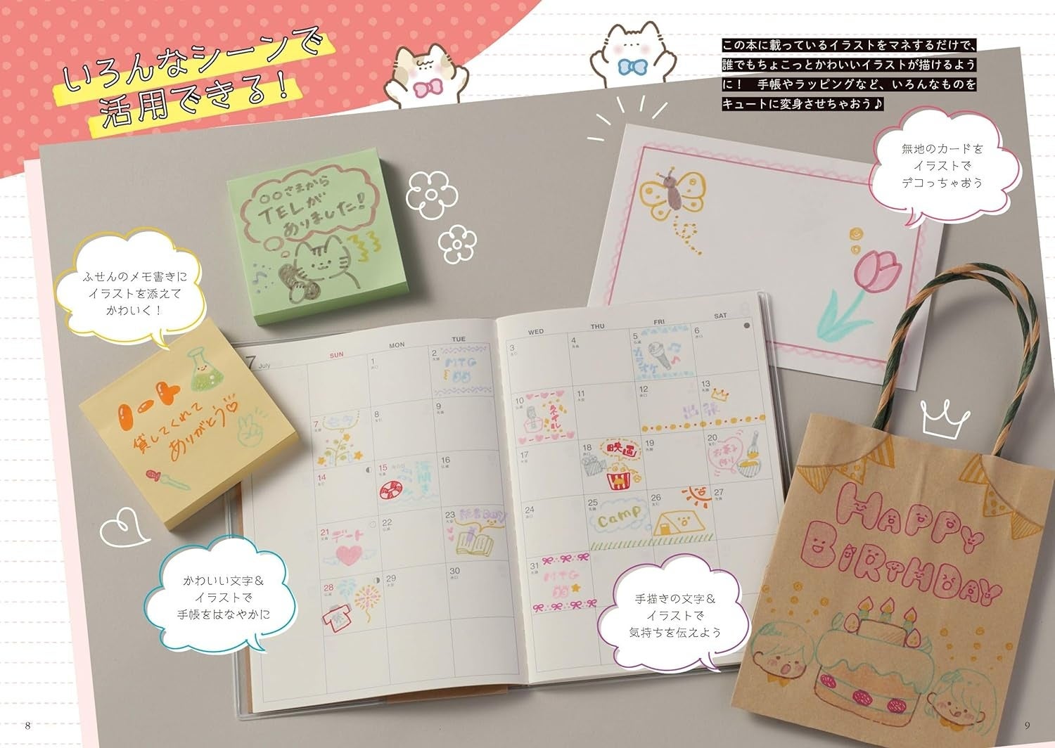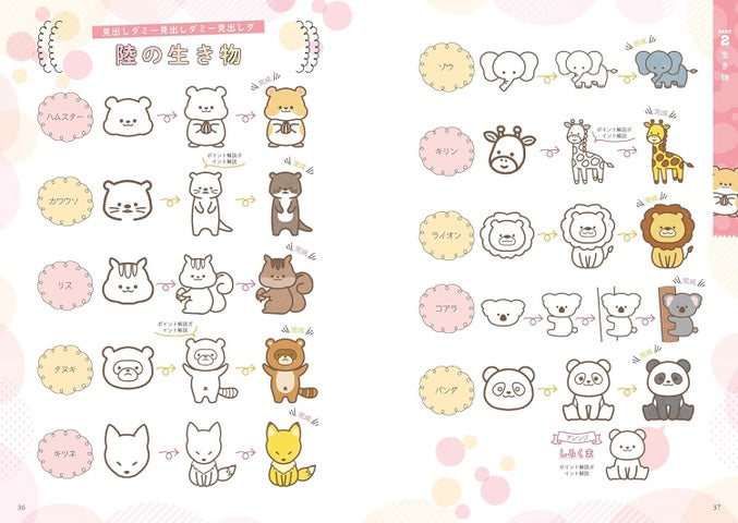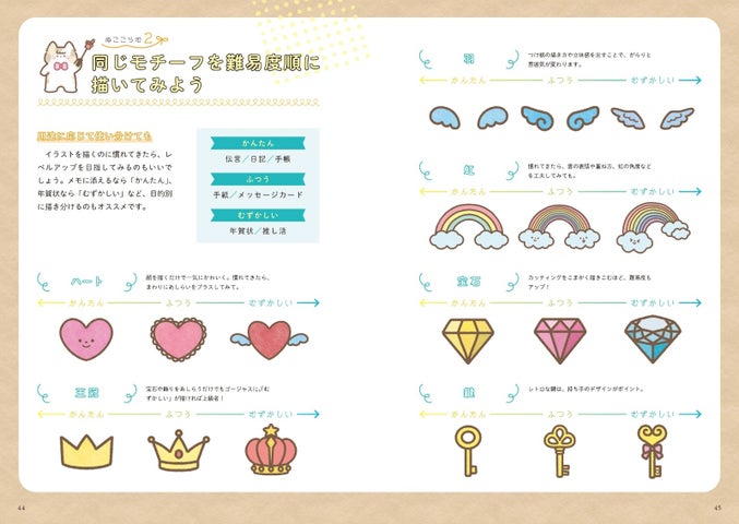 本書ではかわいい動物やスイーツなどのモチーフから簡単に描ける実用的な記号やアレンジ法が紹介されています。