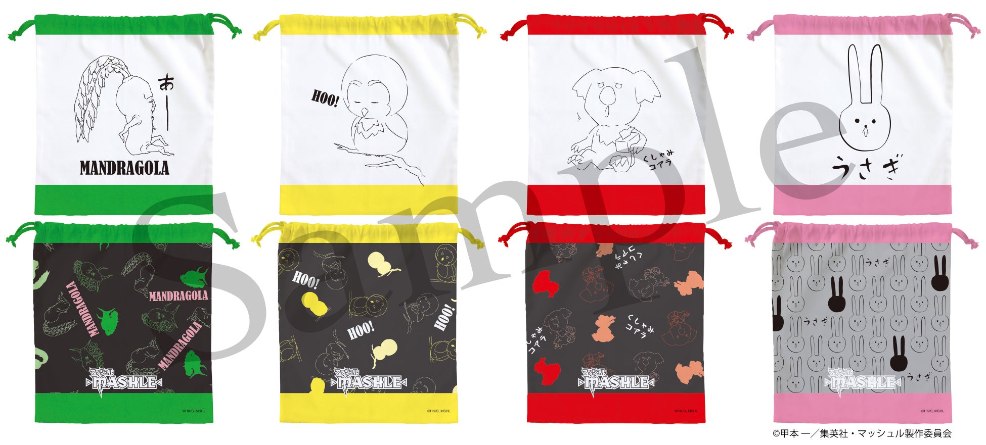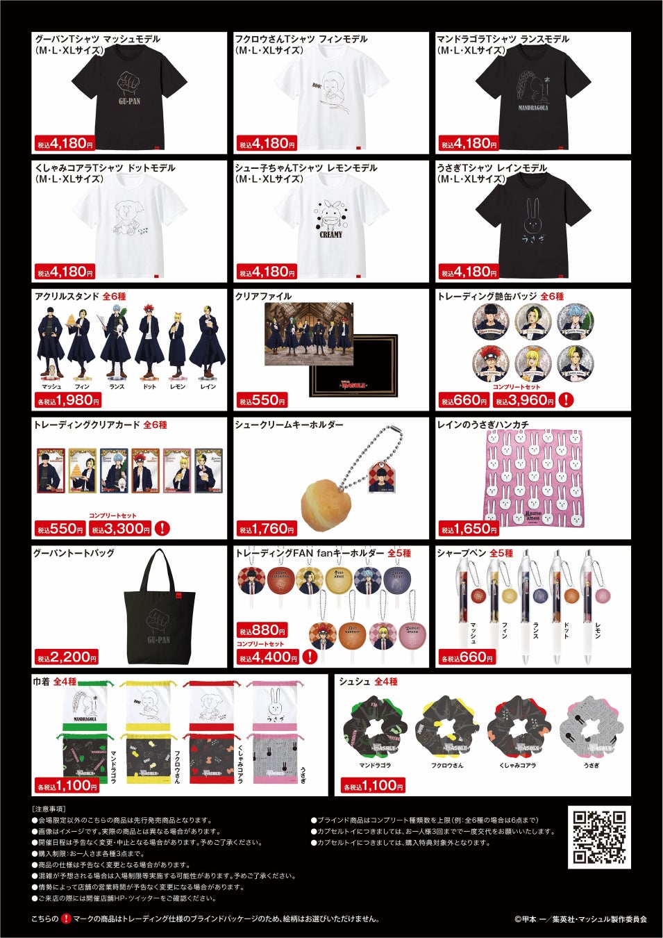 - 期間限定イベントでは、マッシュたちが着ているTシャツやアクリルスタンド、巾着、トートバッグなどのスペシャルグッズが販売される。