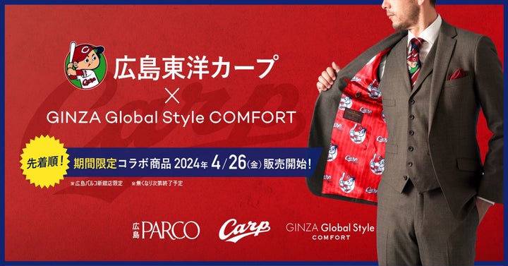 オーダースーツ専門店「グローバルスタイル」が、2024年4月26日より広島東洋カープとのコラボ商品を広島PARCO内の店舗で限定販売開始しました。