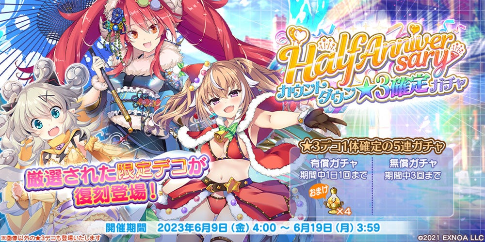 - Half Anniversary前夜祭も開催され、期間限定のログインボーナスや限定デコを含む★3デコ1体が必ず当たるガチャなどが登場する。