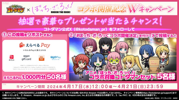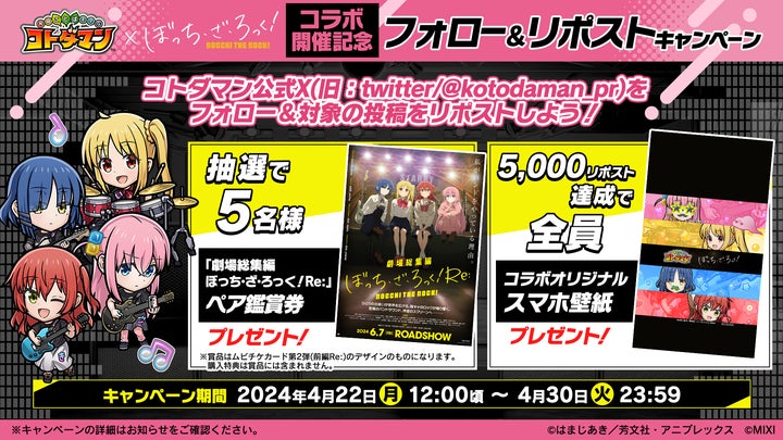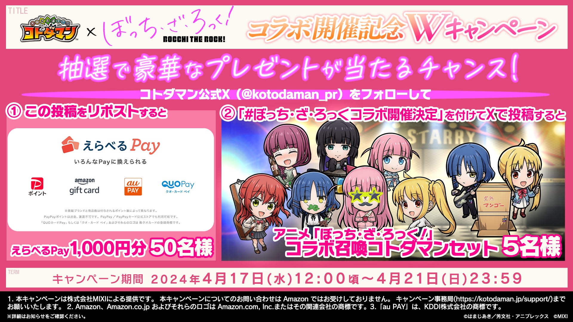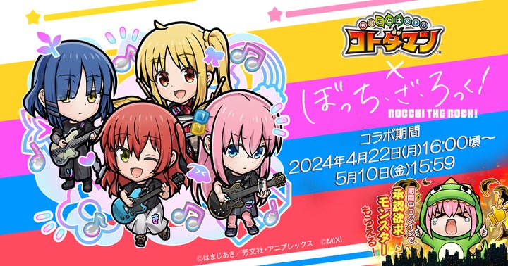 アニメ「ぼっち・ざ・ろっく!」とゲーム「コトダマン」がコラボレーションすることが決定しました。