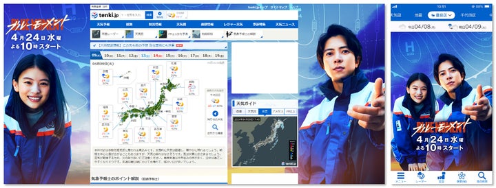 2024年4月17日から放送されるドラマ『ブルーモーメント』の特別仕様イメージが「tenki.jp」のトップページに登場します。