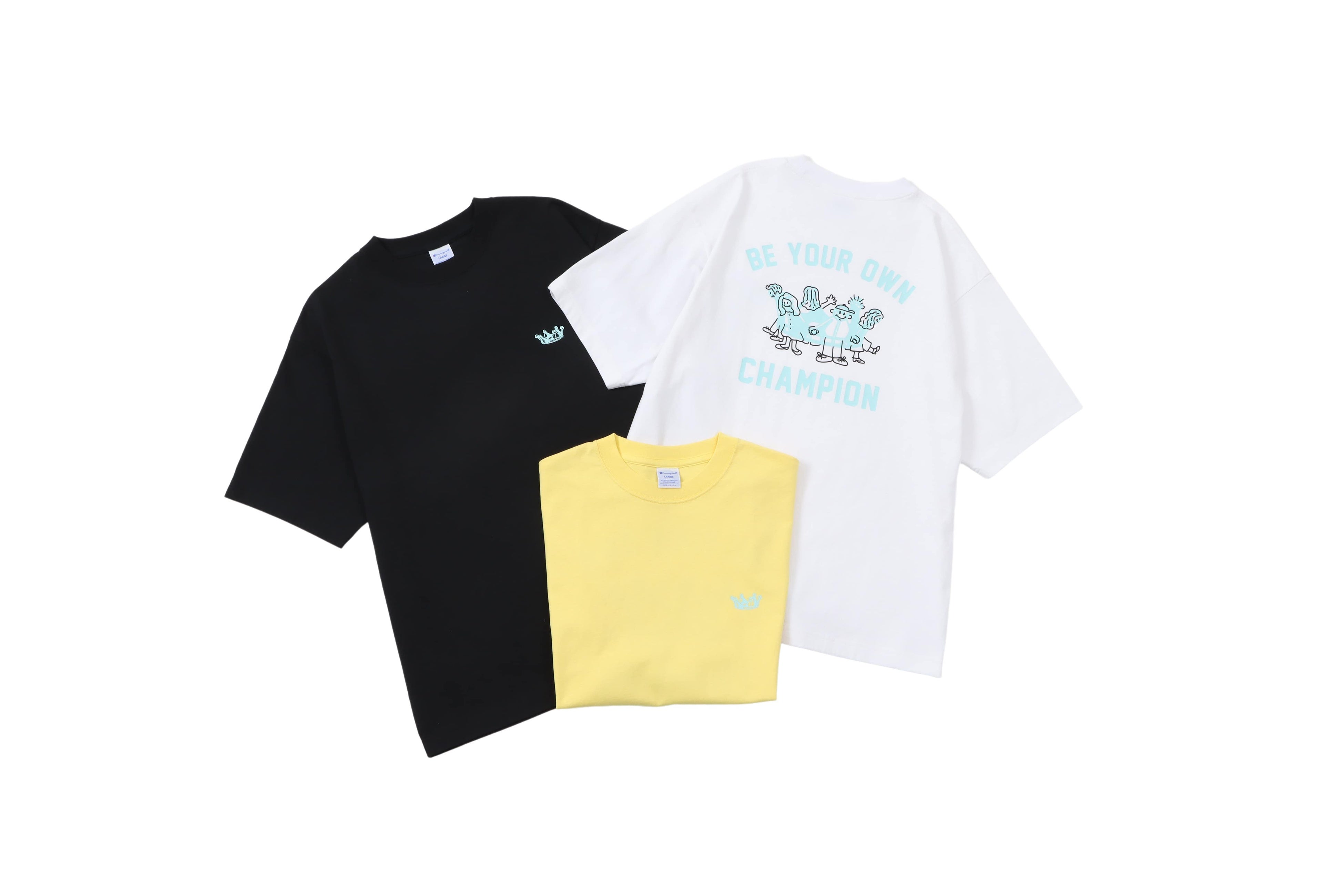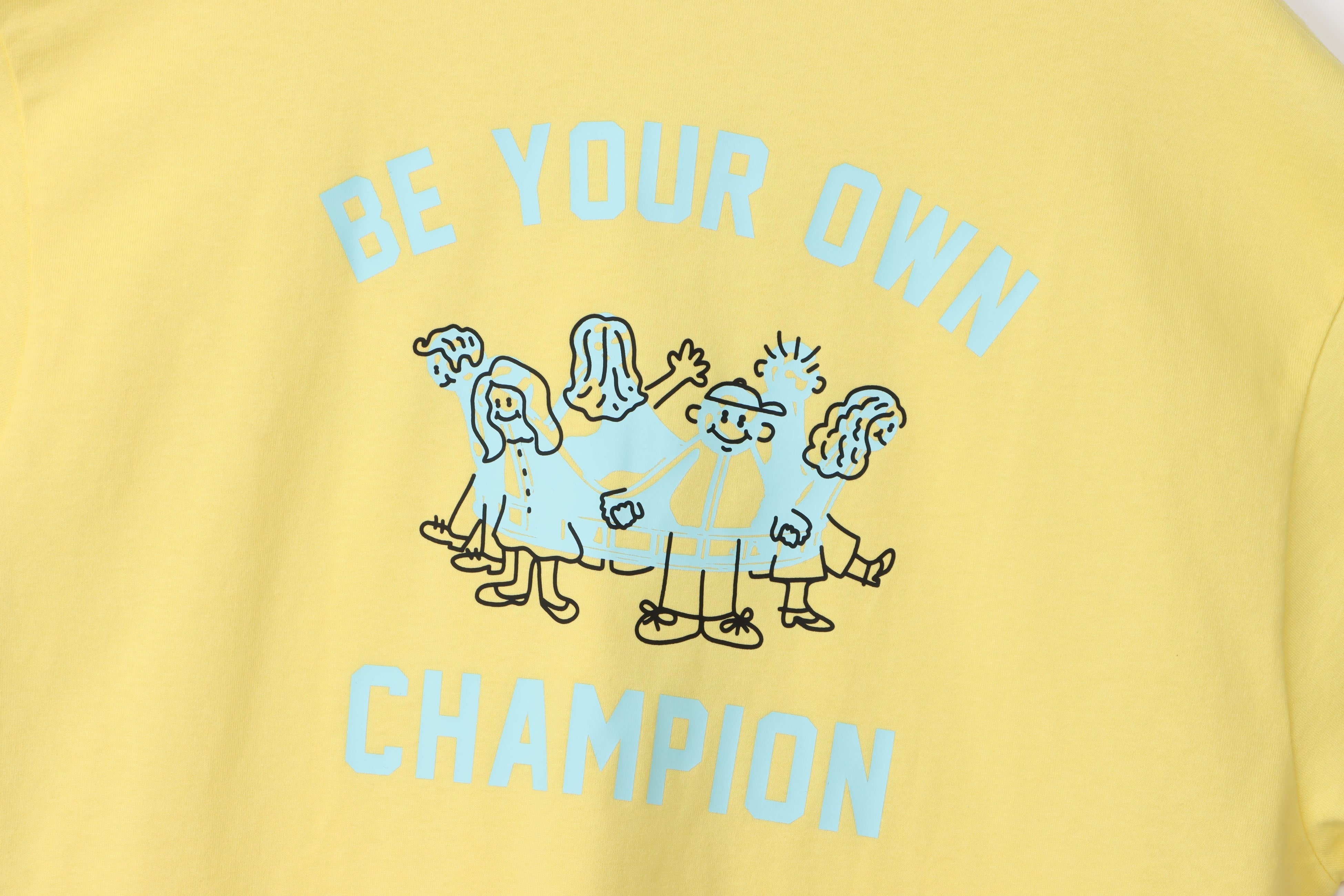 もう一つは、Championというワードから「王冠」をイメージし、王冠のイラスト上に手を繋ぎあったキャラクターが描かれています。キャラクターが敢えて内側に向かずに、手を繋ぐことで「他人を意識せず、自分らしい生き方を」という意味が込められた、まさに“BE YOUR OWN Champion”なデザインです。カラーはホワイト、ブラックに加え、ペールイエローの3色展開で販売いたします。