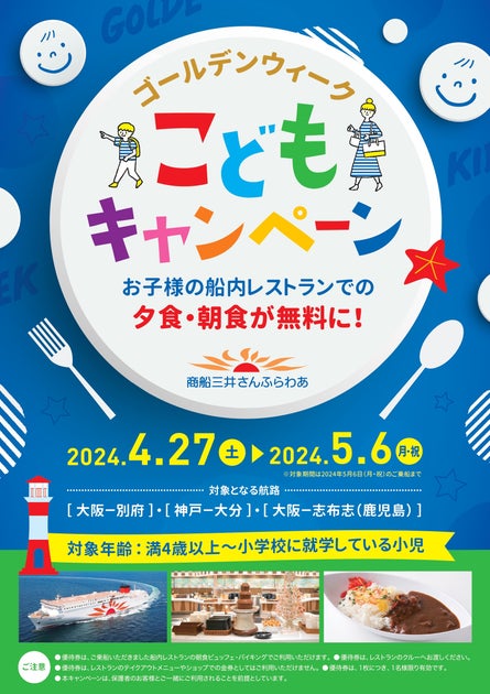 2024年4月27日から5月6日までの期間、大阪~別府、神戸~大分、大阪~志布志(鹿児島)航路では、小学校就学前のお子様を同伴する大人に限り、船内レストランの夕食と朝食バイキングが無料となります。