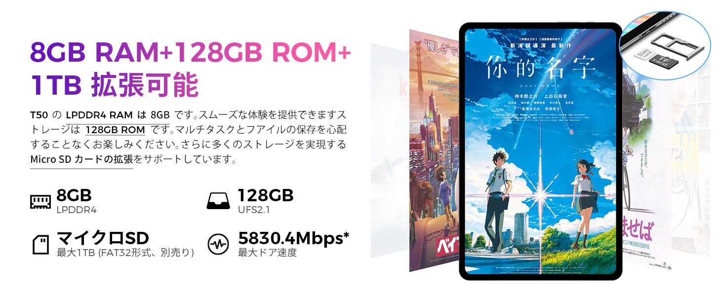 8GB LPDDR4メモリと128GB eMMC5.1のストレージで、写真、ビデオ、ドキュメントをさらに保存できます。また、マイクロSDカードスロットはストレージを最大1TBまで拡張できるため(FAT32形式、別売り)。