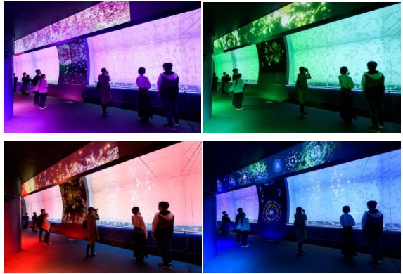 クラゲ大水槽は20トンの水を使用し、光と音、プロジェクションマッピングで四季を表現し、香りも演出に加わります。
