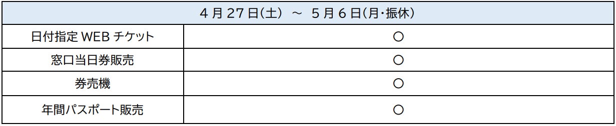 ゴールデンウィーク期間中は営業時間が延長され、チケット販売方法に変更がありますので、事前に確認をおすすめします。