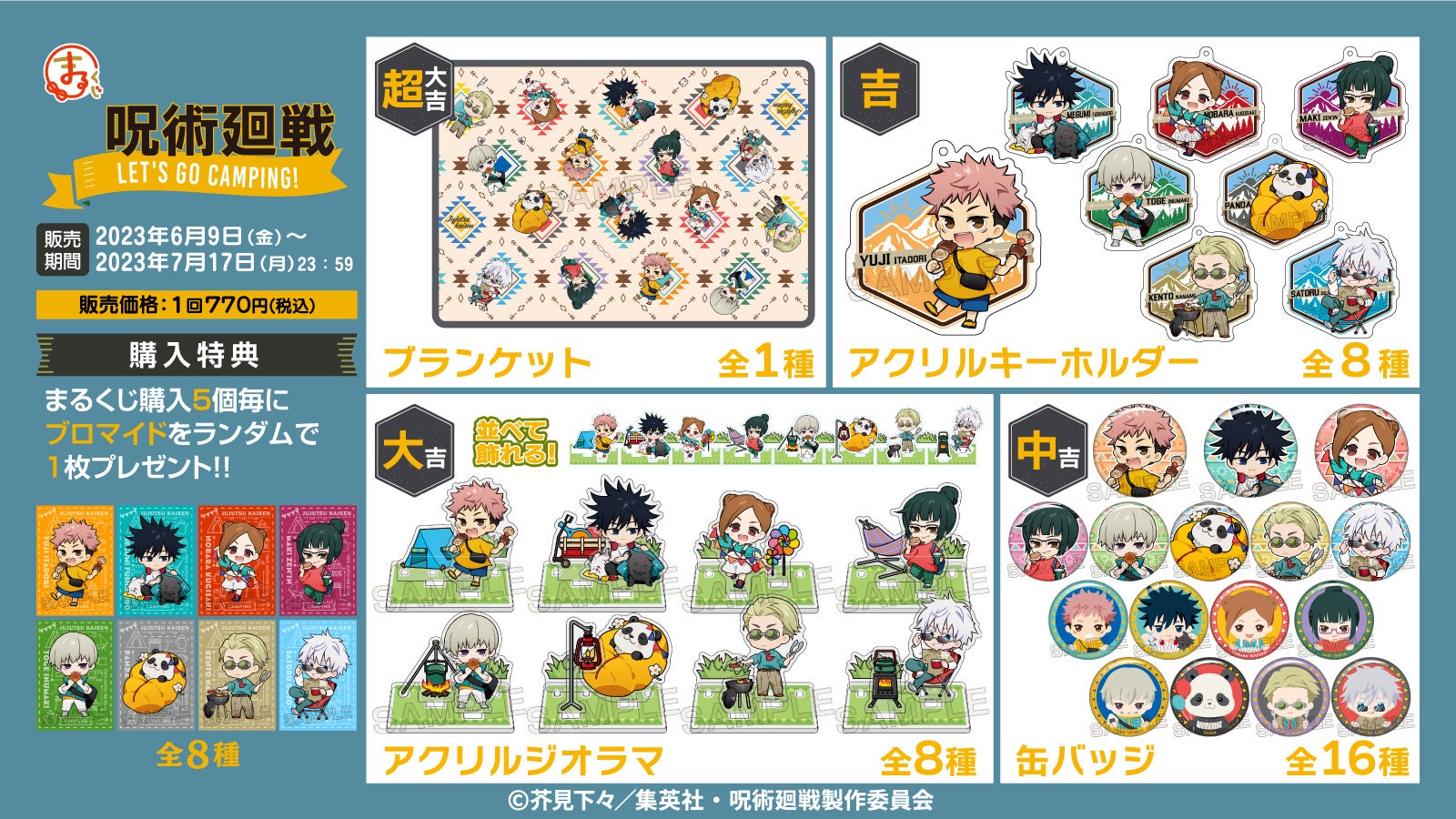 - まるくじ、呪術廻戦オリジナルグッズ、ブランケット、アクリルジオラマ、アクリルキーホルダー、缶バッジ