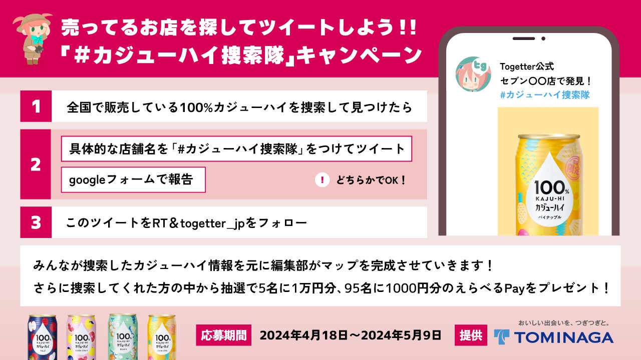 このキャンペーンは、100%カジューハイを見つけやすくするために行われており、トゥギャッター株式会社との連携により新たなファンを獲得し、既存のファン層の購買促進を目指しています。