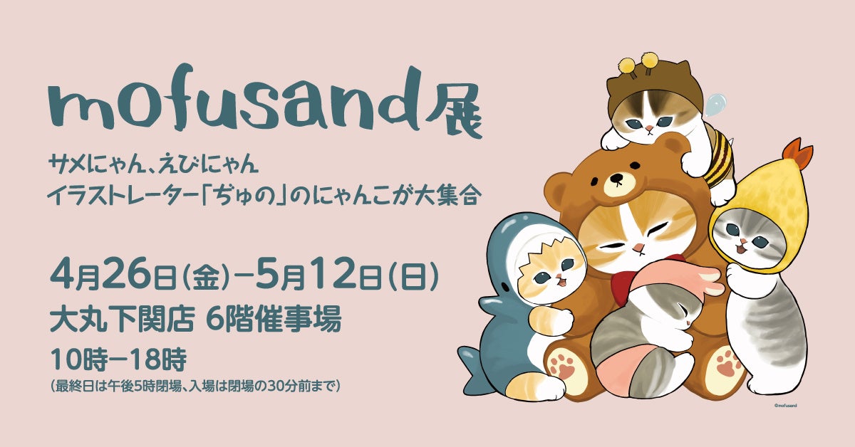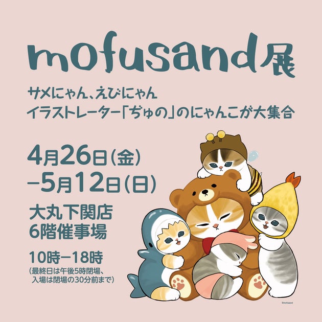 「mofusand展」は、イラストレーター・ぢゅの氏による作品展で、個性豊かなにゃんこたちがシュールでキュートな姿を披露します。