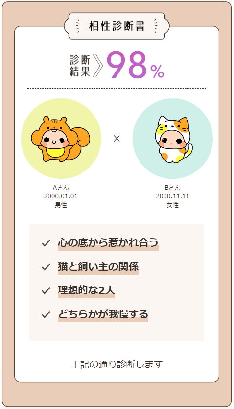 - 基本性質や相性、深層部分を分析し、無料で相性診断書提供