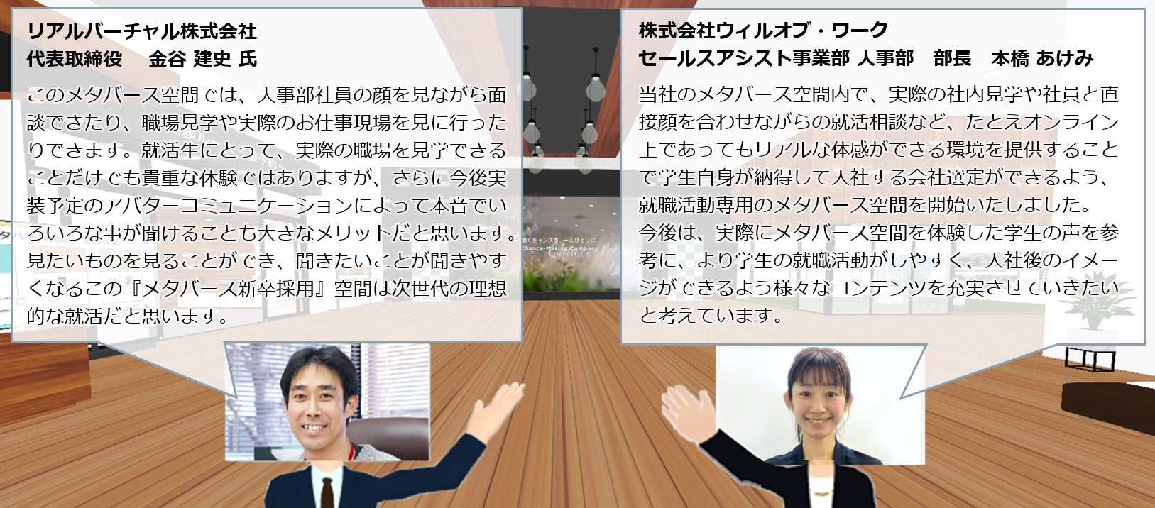 株式会社ウィルオブ・ワークが、リアルバーチャル株式会社が提供するメタバースサービスを活用した新卒採用「メタバース新卒採用」を開始した。