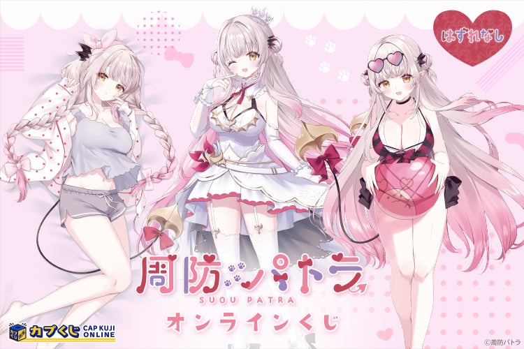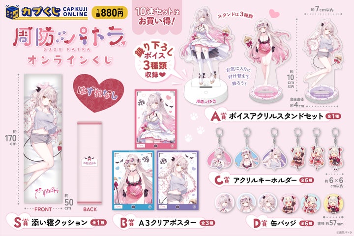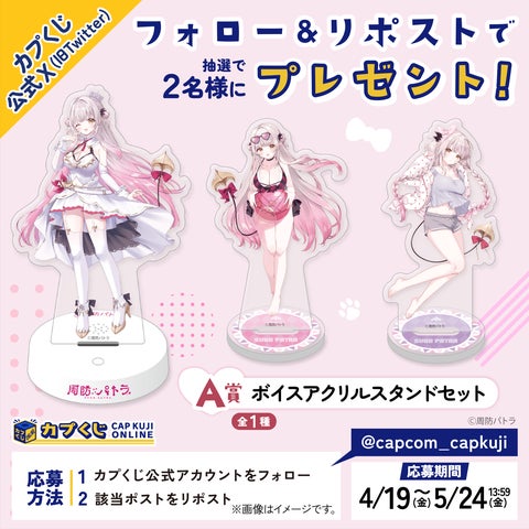 周防パトラとのコラボでは、通常衣装に加えて水着やパジャマ姿も登場!カプくじのボイスデータを使用した特別アイテムも!S~D賞のいずれかが当たるキャラクターくじを開催中で、販売期間は2024年4月19日から5月24日までで、1回880円。