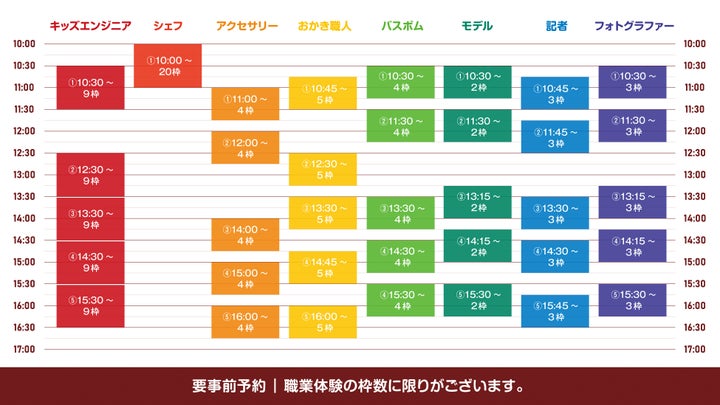 職業体験にはエンジニアやシェフ、アクセサリーデザイナーなどがあり、事前予約が必要です。