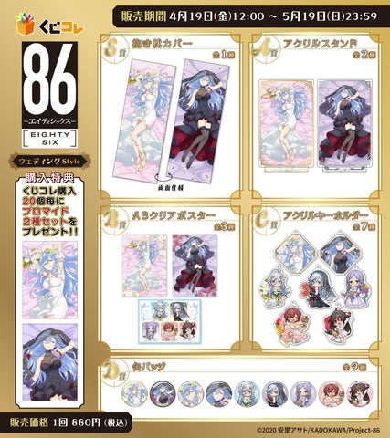 - TVアニメ『86―エイティシックス―』のくじコレでは、新規描き下ろしイラストや描き起こしチビキャライラストを使用した「ヴラディレーナミリーゼ(レーナ)」のウェディングドレスがテーマ