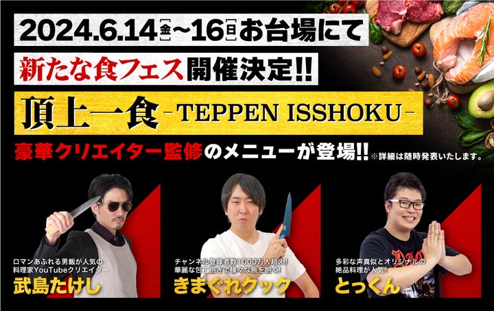 2024年6月14日から16日にお台場で開催される「頂上一食 〜TEPPEN ISSHOKU〜」イベントでは、きまぐれクック、武島たけし、とっくんが監修メニューを提供します。