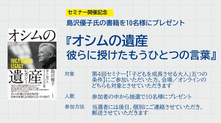 テーマは「子どもを成長させる大人」の条件についてで、会場参加とオンライン参加が可能です。