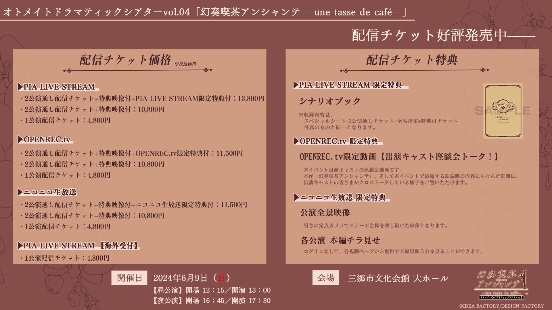 アイディアファクトリー株式会社の女性向けゲームブランド「オトメイト」が2024年6月9日に開催するオトメイトドラマティックシアターvol.04「幻奏喫茶アンシャンテ」の配信チケット販売がスタートしました。