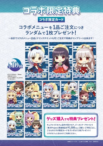 妹紅のスペルカードをイメージした料理やキャラクタードリンクが楽しめ、注文ごとに特典のコラボ限定カードがもらえます。