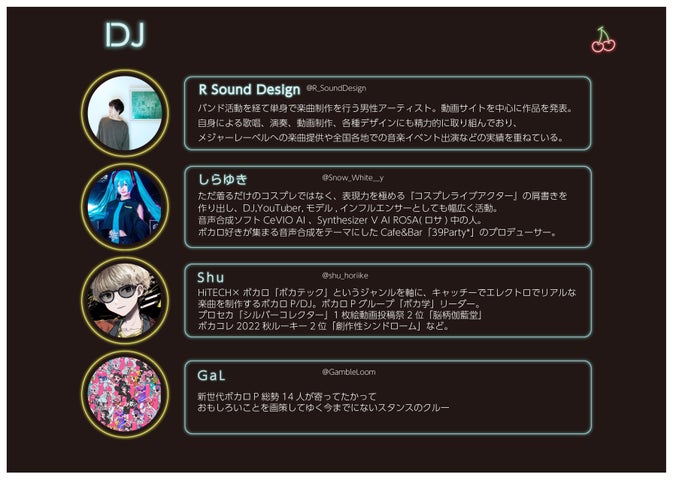 このイベントでは、ボーカロイドを使用した楽曲やDJ、VJによる空間演出が楽しめます。