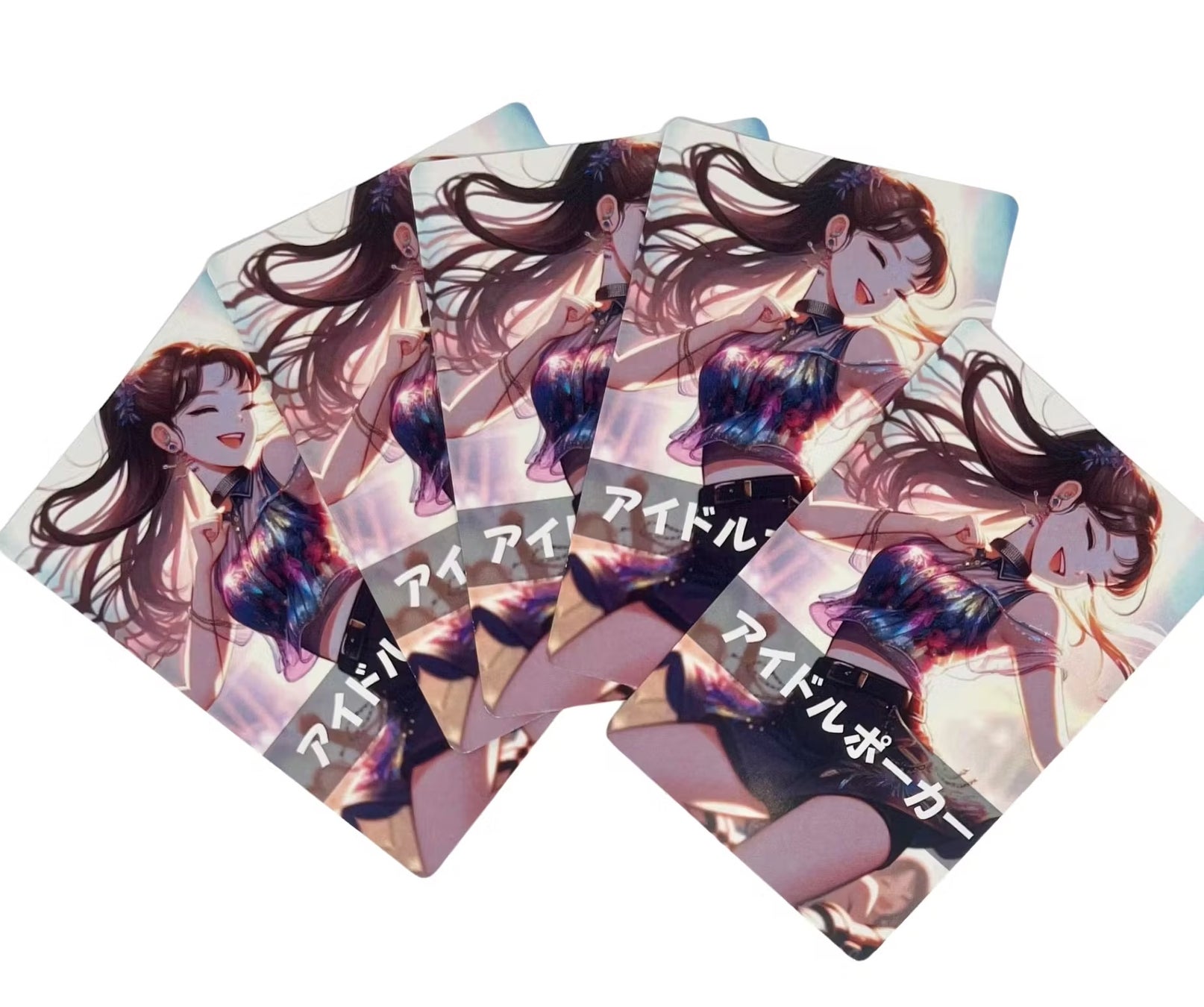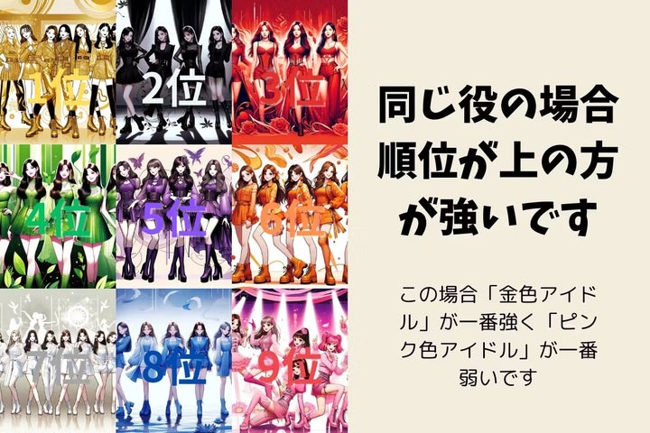 このゲームは、9色のアイドルグループが対決するトランプゲームで、プレイヤーはアイドルカードを5枚集めて役を競います。