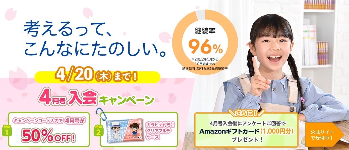 さらに、期間中に通信教育(教材配送)4月号にご入会され、アンケートに回答するとAmazonギフトカード1,000円分プレゼント