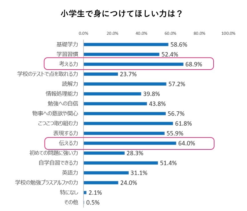 小学生の保護者660名に実施されたアンケート調査によると、「考える力」が小学生に身につけてほしい力の1位となった。