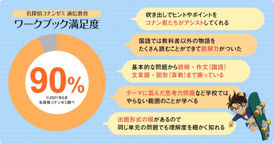 小学館の通信教育 名探偵コナンゼミが2021年に実施した会員アンケート調査では、「入会してよかった」と回答された方が90%(※2)、「基礎・基本が定着する」と回答された方が90%(※3)という結果で、教材の満足度が高く、小学校で押さえておきたい基礎・基本の学習にも強い教材だということが証明されています。