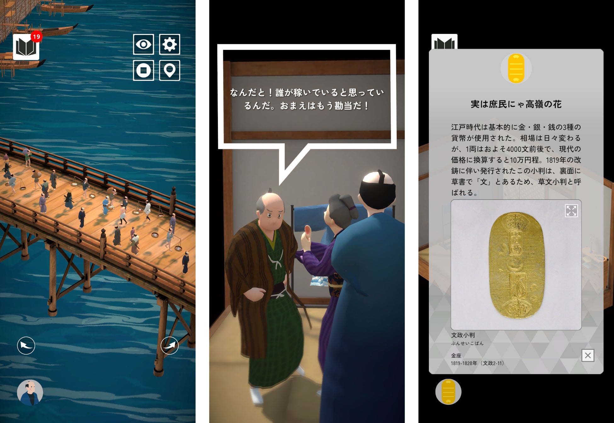 江戸東京博物館が4月22日に公開したスマートフォンアプリ「ハイパー江戸博 日本橋繁昌記 江戸のお金編」は、ゲームエンジンを使用した体験型アプリで、江戸・東京の歴史や文化を学べるコンテンツを提供しています。