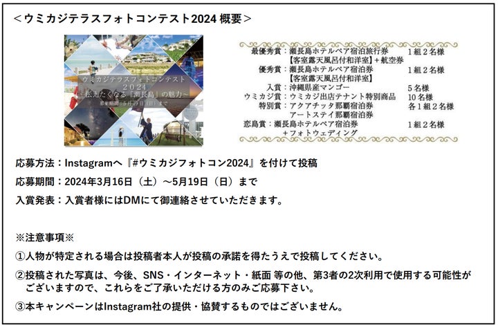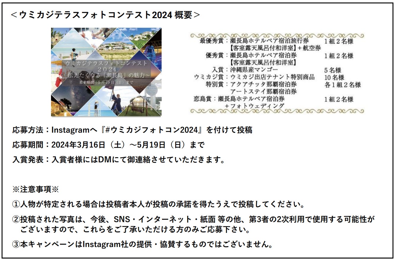 また、ウミカジテラスフォトコンテスト2024も同時開催で、フォトウェディングやカップルフォトが豪華賞品として用意されています。