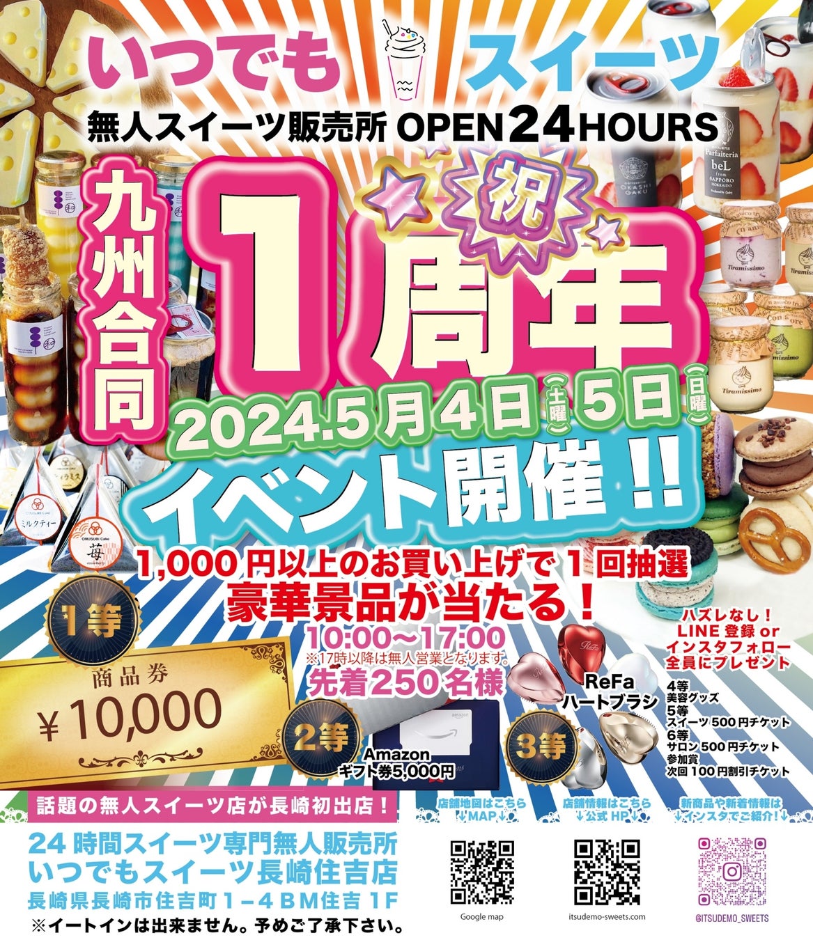 Createurが運営する無人スイーツ販売店「いつでもスイーツ長崎住吉店」が1周年を迎え、5月4日、5日に九州9店舗でイベントを同時開催します。