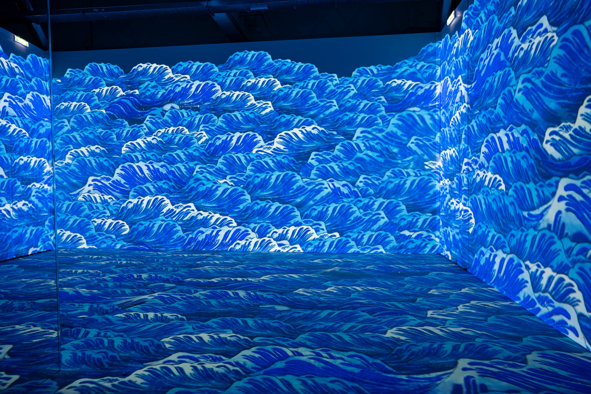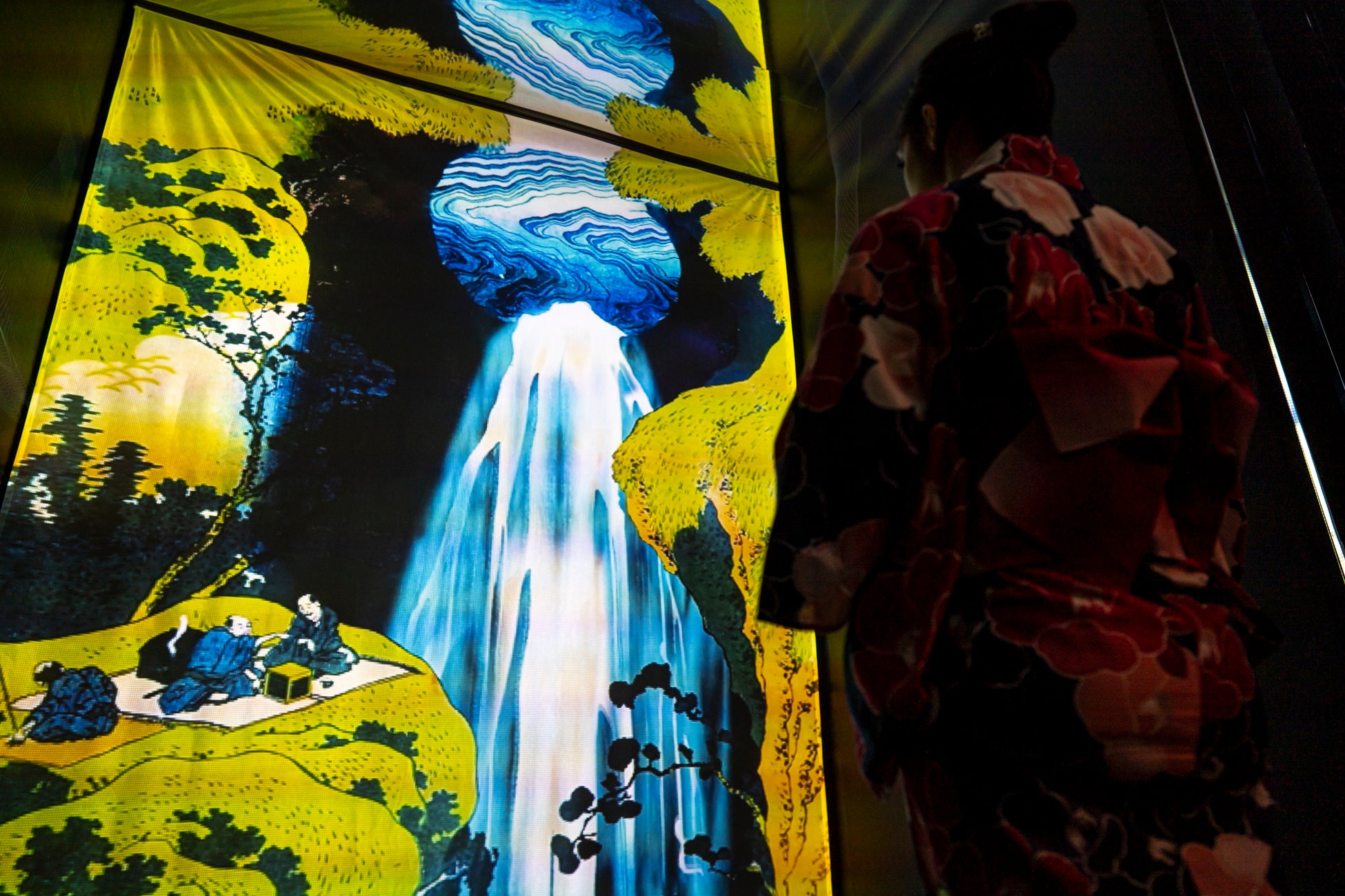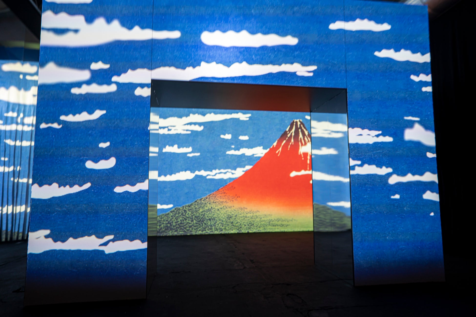 浮世絵師の作品を元にしたデジタルアート作品が展示され、立体映像空間で没入体験が可能です。