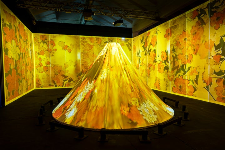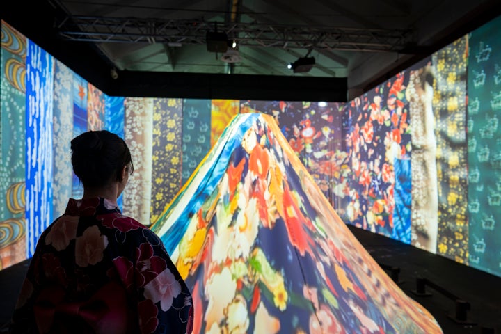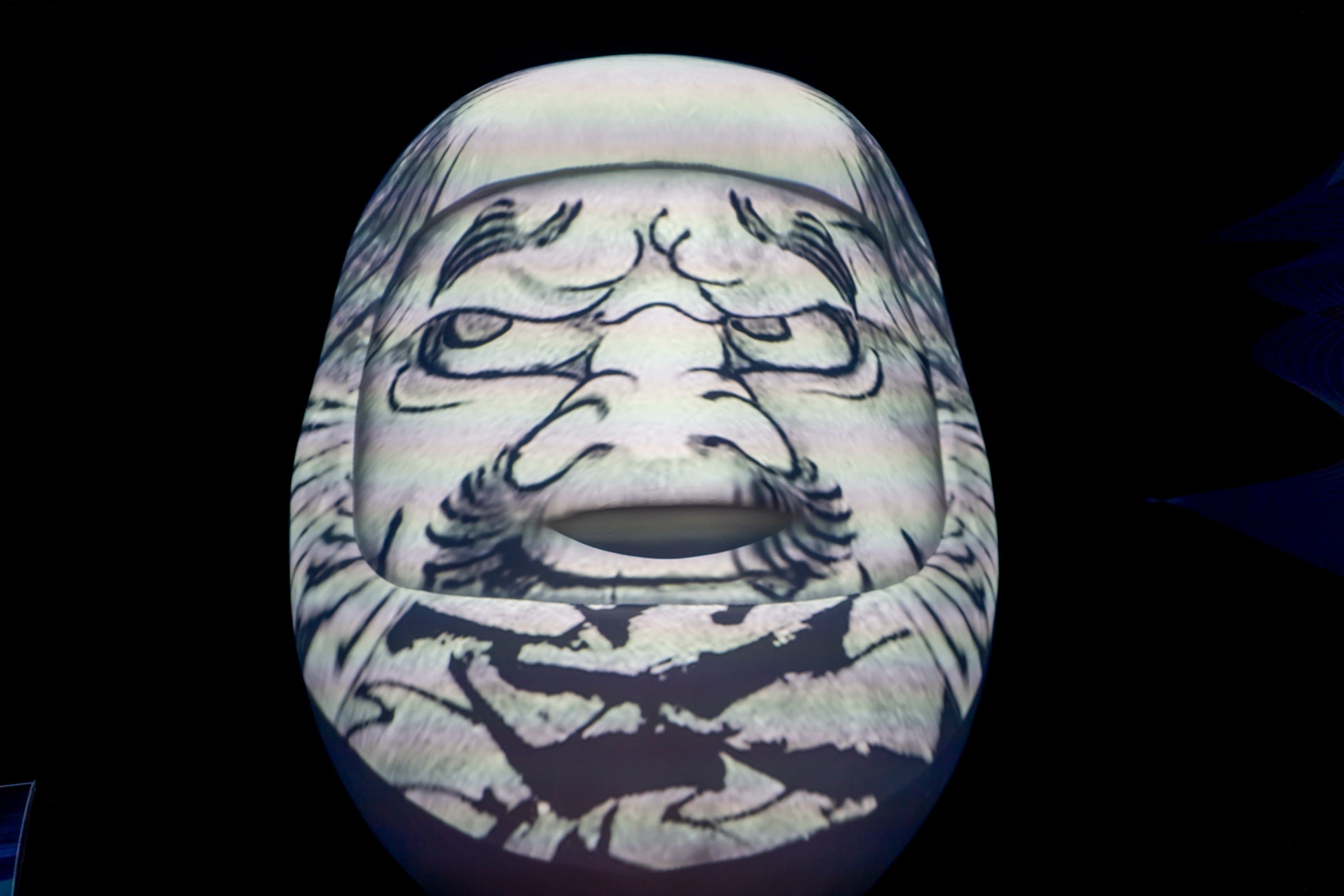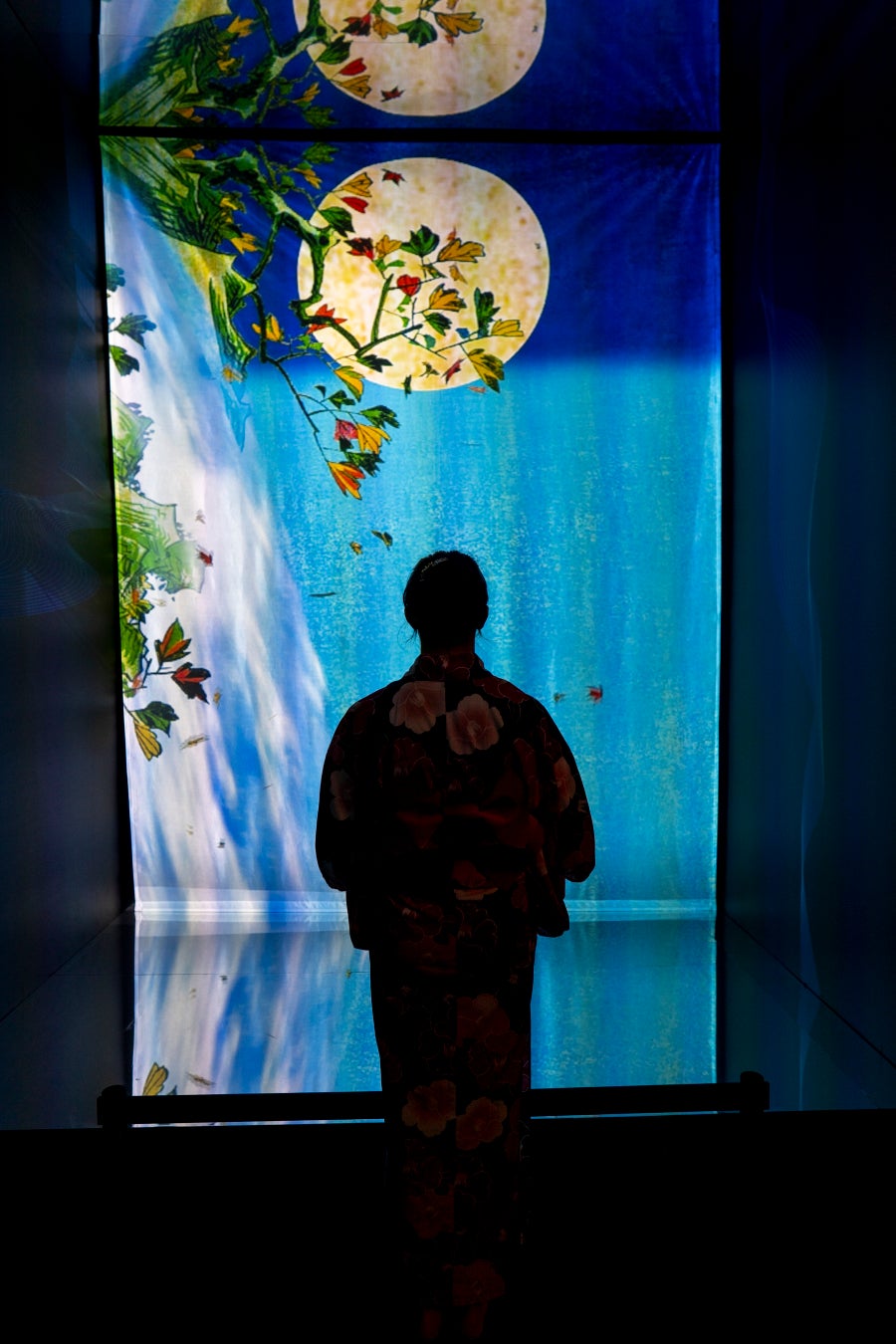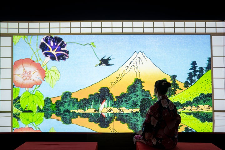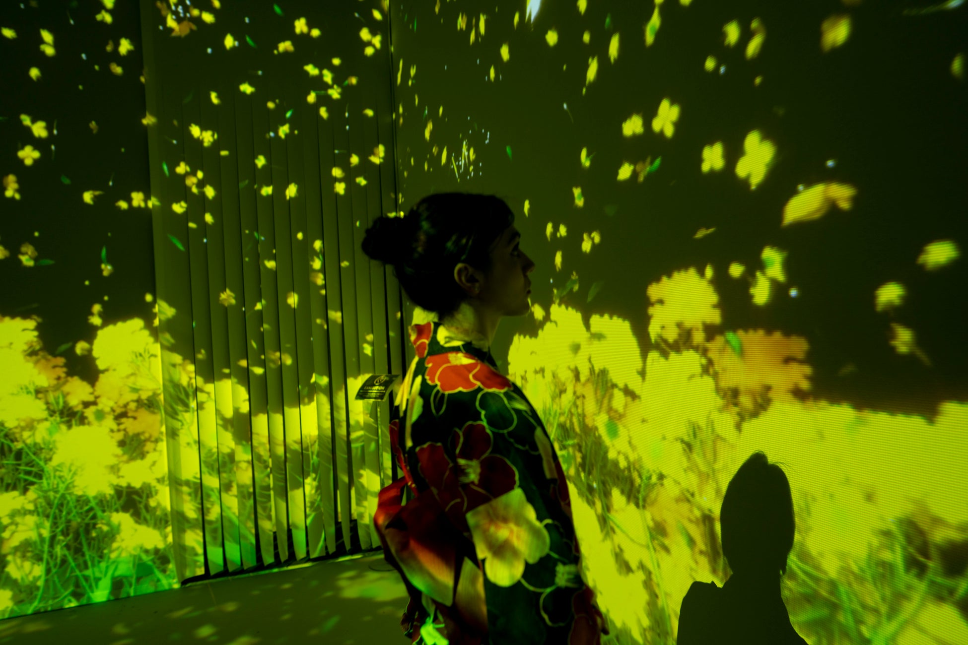 浮世絵師の作品を元にしたデジタルアート作品が展示され、立体映像空間で没入体験が可能です。