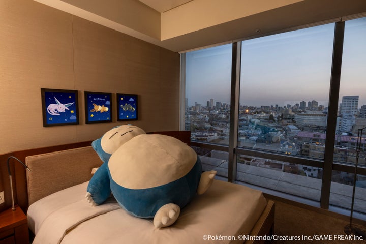 『ポケモンスリープ』スイートルームステイでは、客室内に『ポケモンスリープ』の世界をイメージした装飾を施し、ほぼ等身大のカビゴンのぬいぐるみなどとともに没入体験を楽しめます。