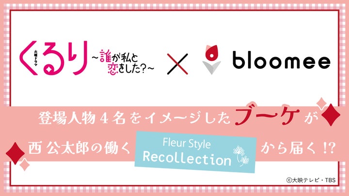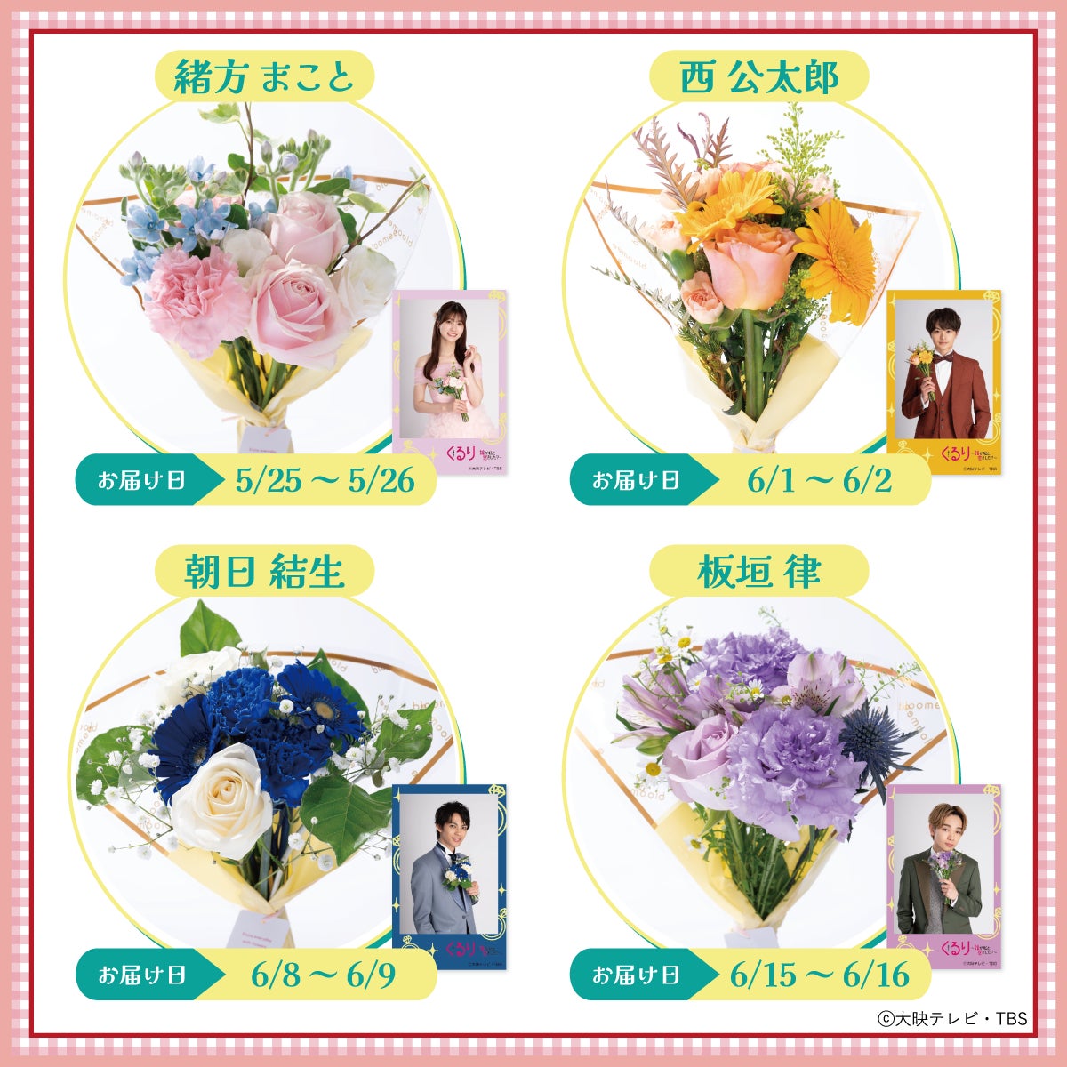 ドラマ「くるり~誰が私と恋をした~」の登場人物4名をイメージした季節のお花のブーケと限定フォトカードがセットになったブーケセットが販売されます。