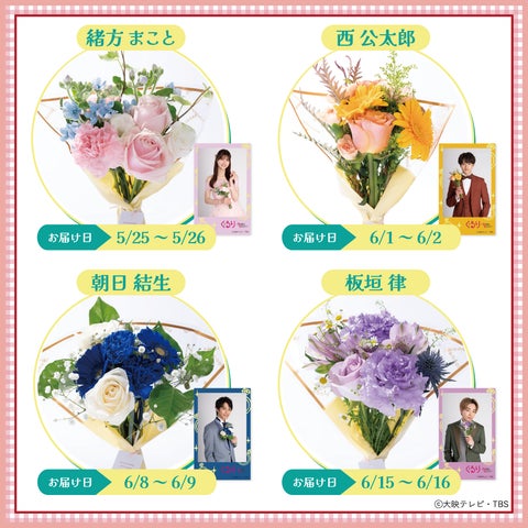 各登場人物ごとのブーケセットやコンプリートセットがあり、お届けは放送期間中に予定されています。