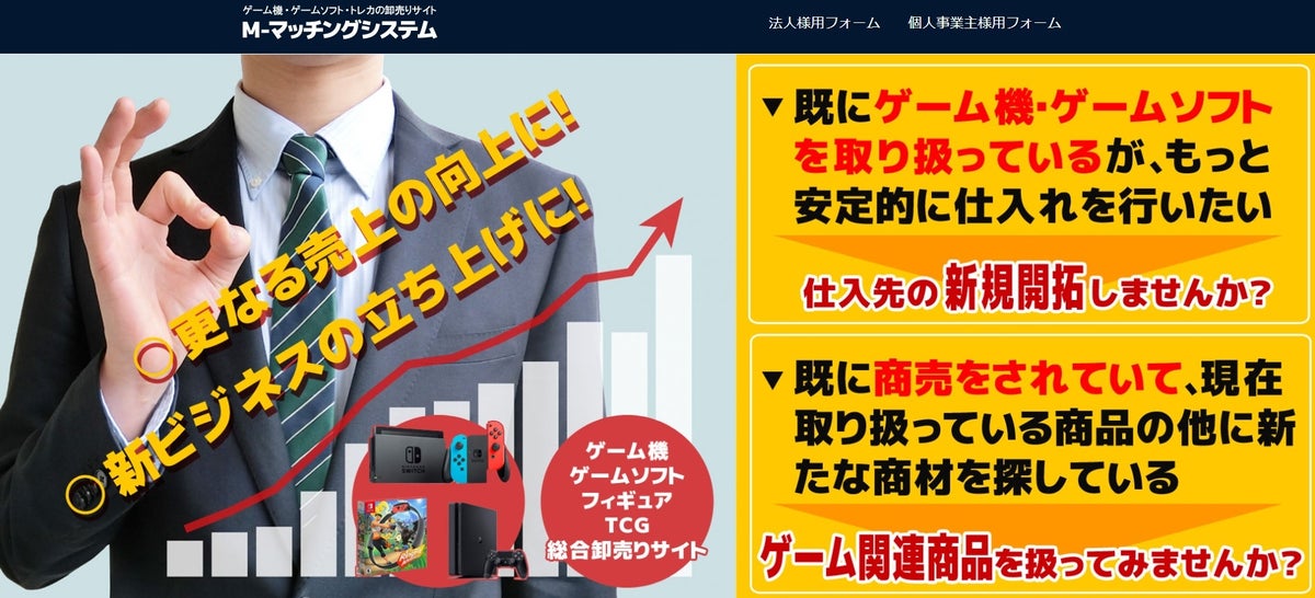 M-マッチングシステムは、マッチングワールド株式会社が提供するサービスで、完全匿名性&小ロットから発注可能な会員制の卸売・仕入れサイトです。