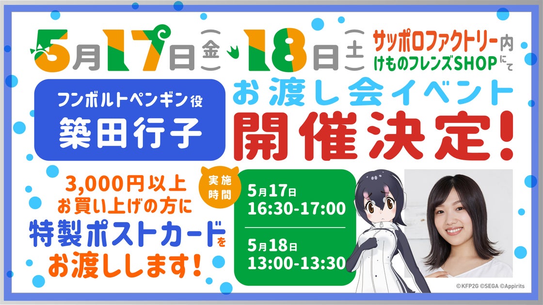 2024年5月17日から19日にサッポロファクトリーで開催される「けものフレンズ3 SHOP 2024 in SAPPORO」では、築田行子によるお渡し会や新グッズの販売が予定されています。
