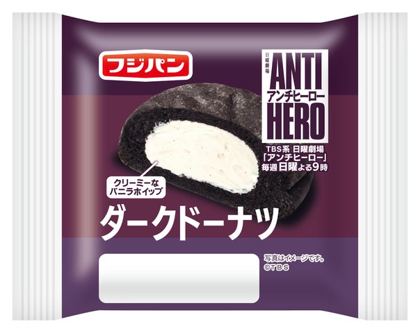 第2弾コラボ商品『ダークドーナツ』は、竹炭入りの黒生地にバニラホイップを組み合わせ、善と悪を表現しています。
