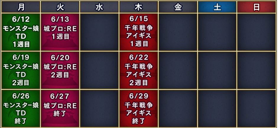 6月12日(月)より『モンスター娘TD』、『城プロ:RE』、『アイギス』の順にスタート!