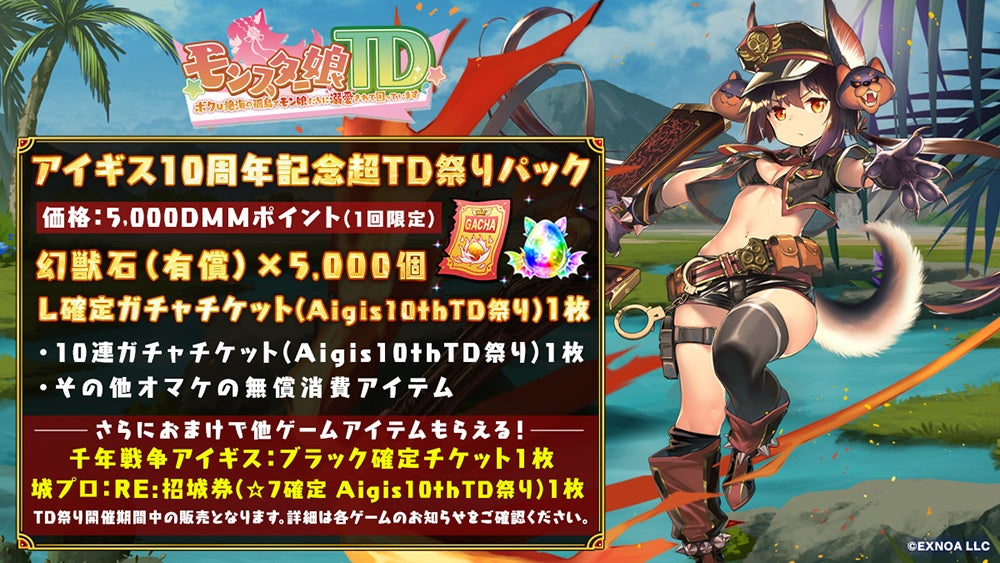 イベント開催期間中、各タイトル1回限定で、ガチャチケットや便利アイテム、各タイトルのガチャチケットが詰まった「アイギス10周年記念超TD祭りパック」を5,000DMMポイントで販売します。
