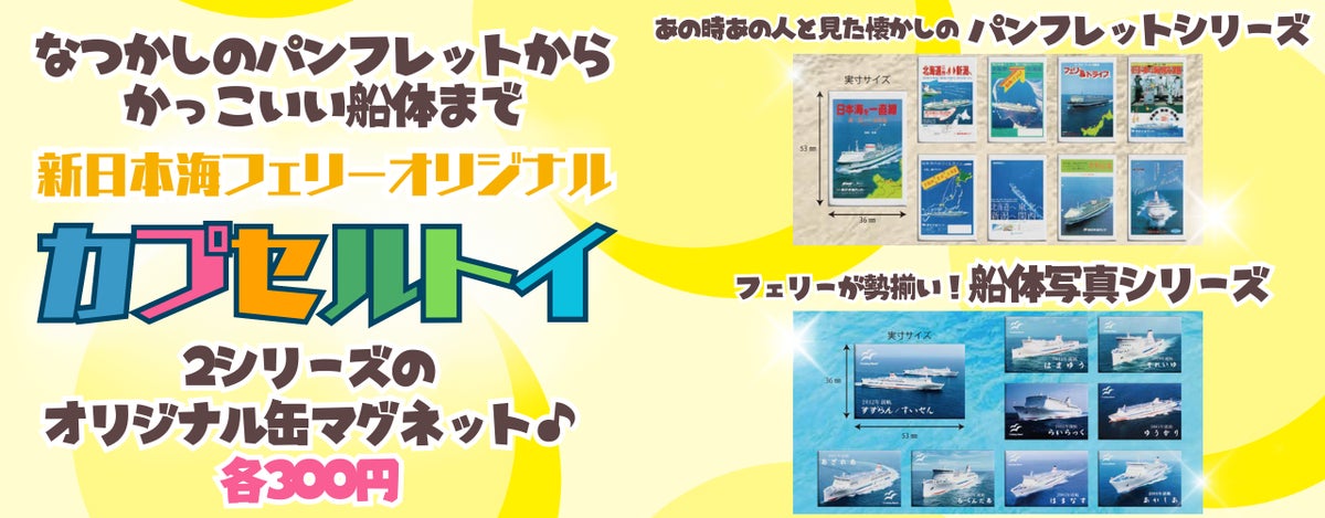 新日本海フェリーが展開するカプセルトイシリーズが登場しました!懐かしいパンフレットや船体写真を缶マグネットに再現♪ 全9種類、それぞれ300円で販売開始は2024年4月24日から。