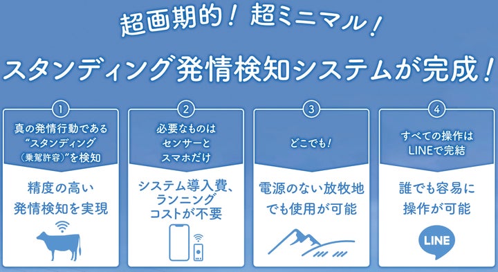 さらに、LPWA通信規格を使用することで放牧地でも運用可能であり、スマートフォンアプリLINEを介して容易に操作できます。