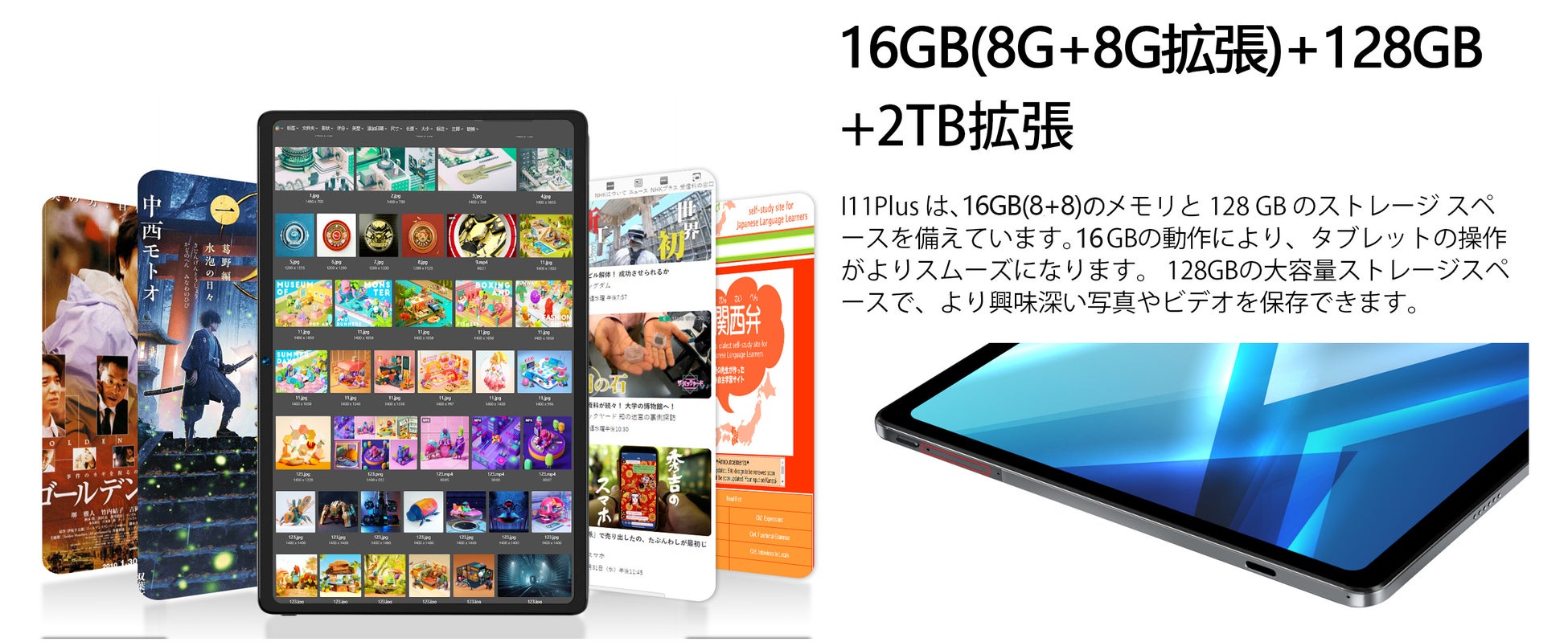 【16GBのランニングメモリと128GBの高速ストレージを搭載】ストレージに拡張可能なMicroSDをサポートしています。メモリ容量が大きいとタブレットはサクサク動くようになります。Webサイトや動画を見たり、重いアプリや高画質のゲームを楽しみいただきます。お気に入りの本、曲、写真、映画、ゲームなど、好きなものをすべてダウンロードして保存できます。容量不足に困ることなく十分にお楽しみいただきます。