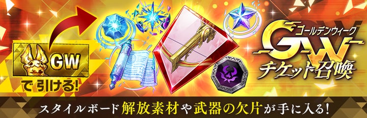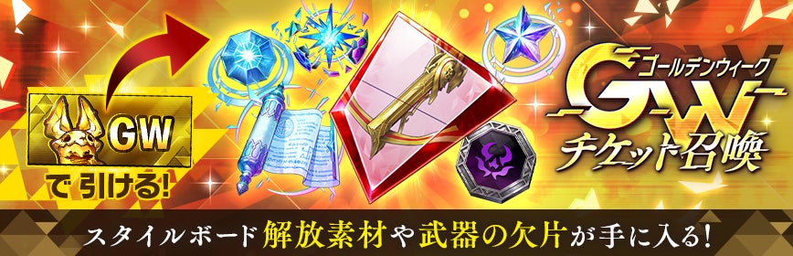 GWチケット召喚や限定クエストが登場し、素材や武器の欠片が手に入ります。